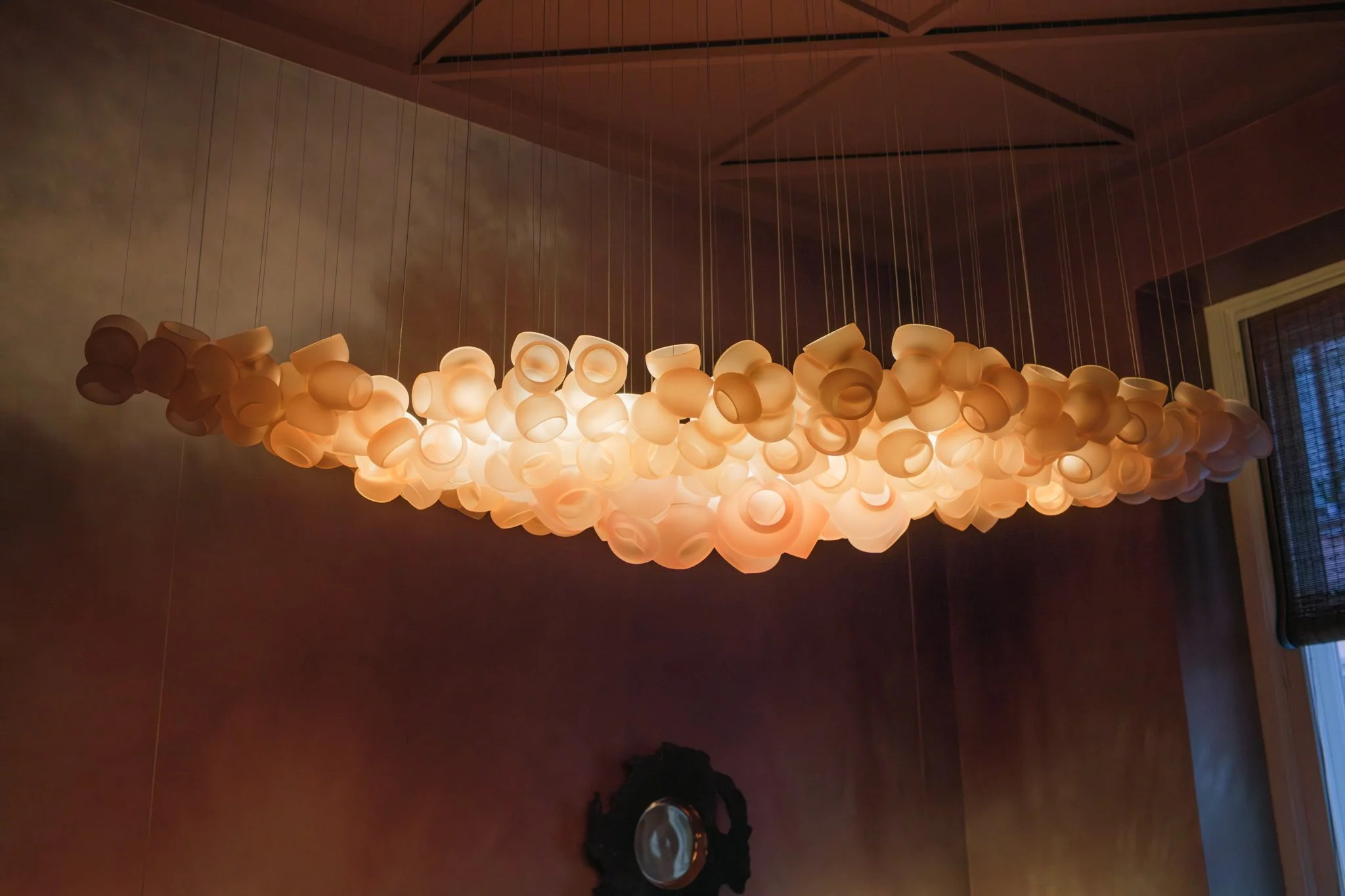 The 141 series is crafted by pouring two ladlefuls of hot glass freehand over a curved rod to create two overlapping puddles. The rod is then lifted, and the puddles wing out into an unpredictable shape in a gesture that is both simple and cinematic at once. After this process, the rod is replaced with an LED light source. The 141 is meant to be hung as a single element or in clusters, with the irregular shapes conversing with one another.