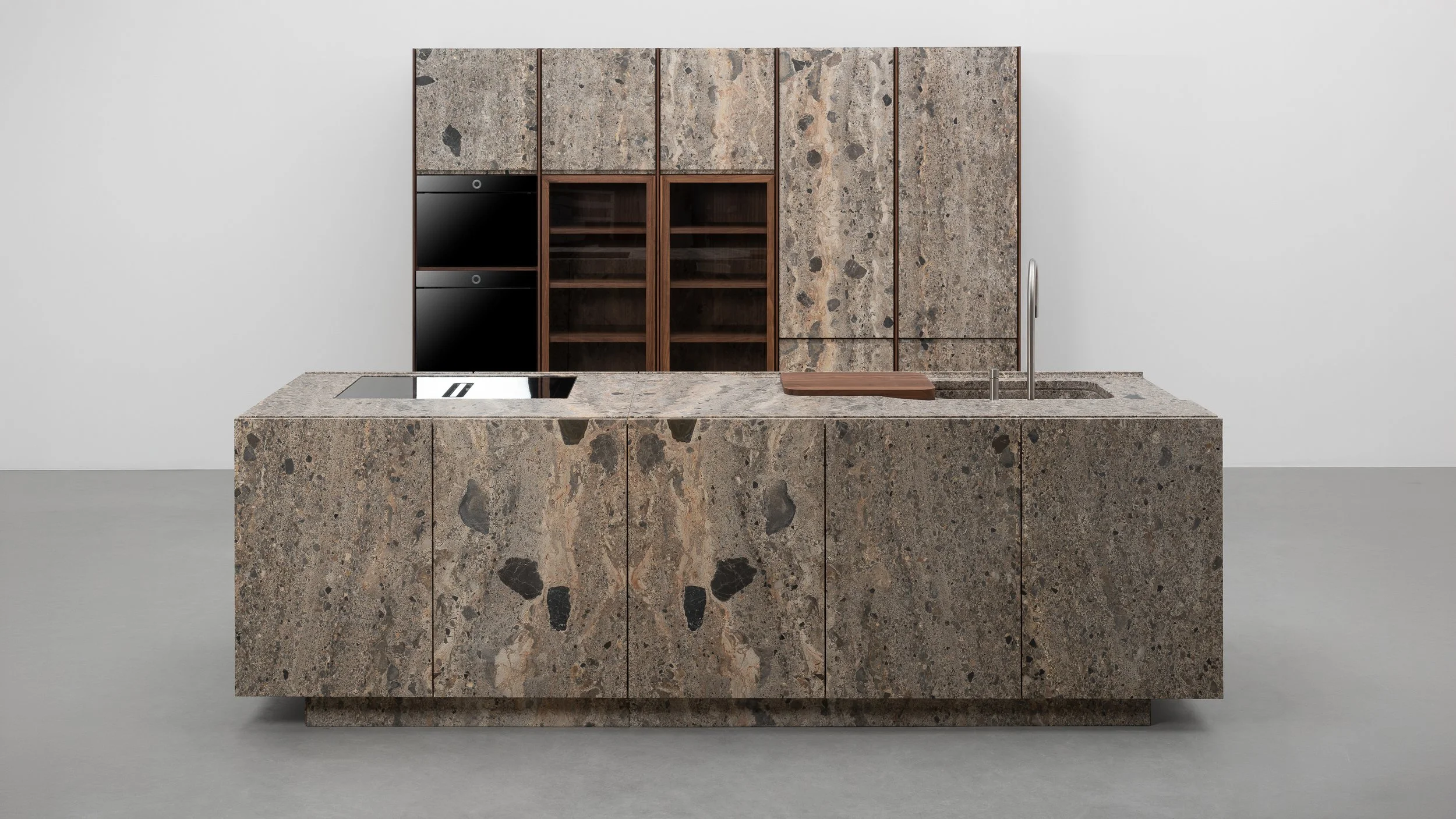 OCO — Vaselli's most versatile kitchen, available in travertine, marble, metal, and wood. Islands with sinks carved from solid stone and slab-matched doors that read as a single monolithic form. Fidia (Nicola Gallizia) — entirely clad in Rapolano travertine, inspired by the assembly techniques of ancient Greek sculptor Phidias, where individually crafted stone components join into one monolithic element. Sider (Gargano & Fagioli) — stone and iron stripped to their structural essentials. Chrysalis (Irene Goldberg) — a monolithic outdoor kitchen carved from Becagli travertine, winner of the German Design Award 2020. June (Kensaku Oshiro) — a kidney-shaped outdoor kitchen with integrated sink and cooktop, carved from a single travertine block.